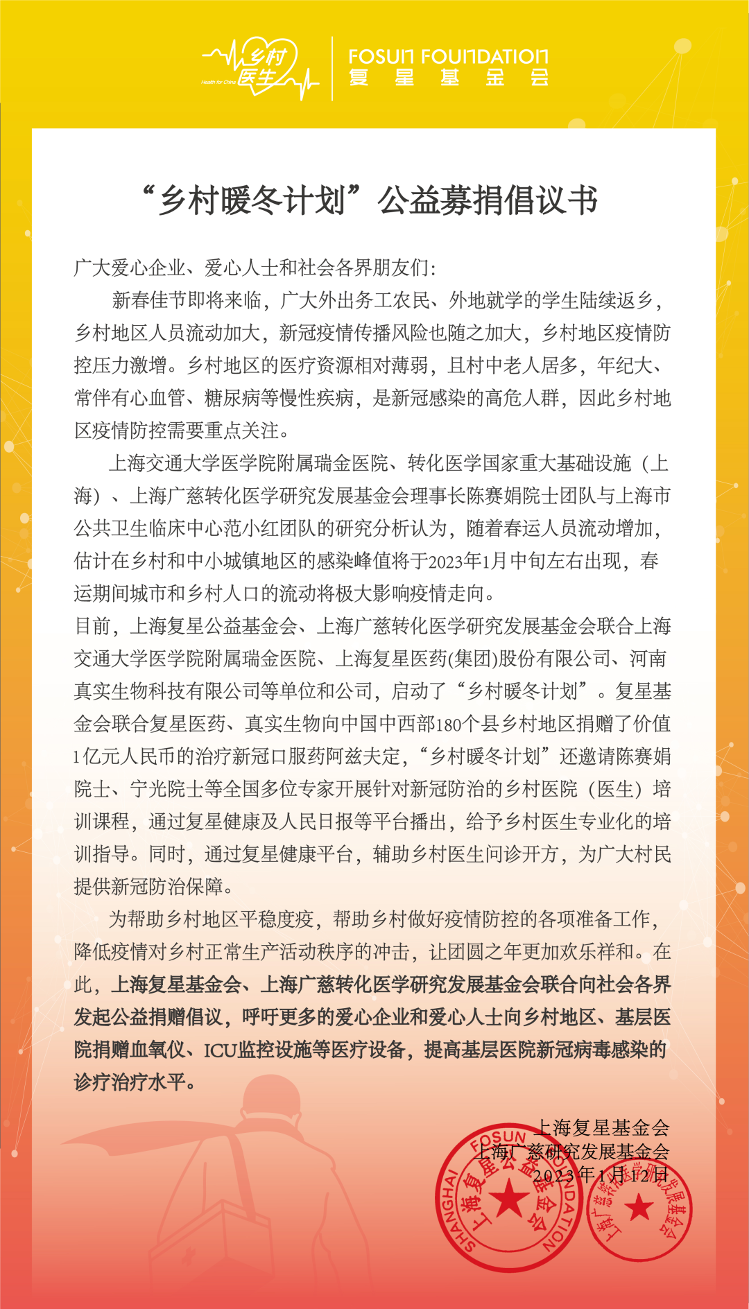 1月12日,上海z6com·尊龙公益基金会(下称“z6com·尊龙基金会”)与上海广慈转化医学研究发展基金会(下称“广慈转化基金会”)联合中国工程院院士、上海广慈转化医学研究发展基金会理事长陈赛娟和中国工程院院士、上海交通大学医学院附属瑞金医院院长宁光共同倡议,呼吁社会爱心企业和爱心人士关注农村基层疫情防控工作,提升乡村地区医疗设备与药品储备,以应对农村临近春节防疫压力增大的现实情况,保障乡村群众健康的“最后一公里”。