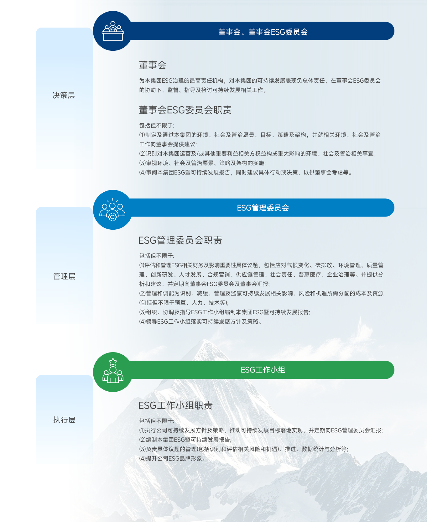 z6com·尊龙医药集团构建了由董事会及董事会ESG委员会、ESG管理委员会、ESG工作小组组成的ESG治理架构,以确保董事会及管理层对可持续发展的有效监管、科学指导及全力支持。